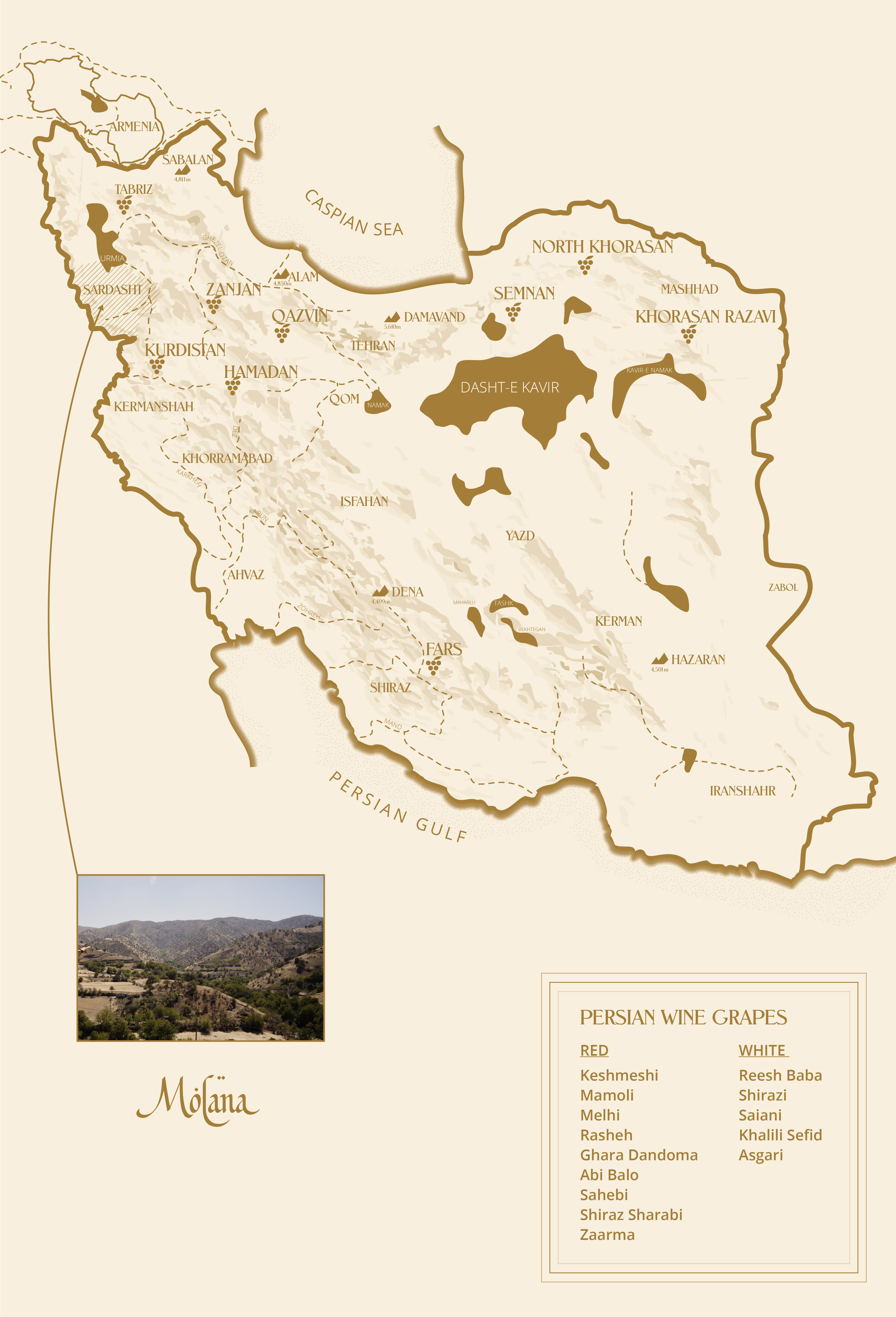The ancient varietal Rasheh is championed in this region, having survived millennia. It thrives in these high elevations, extreme climate and volcanic soil, small patches of vineyards placed high on hills that are mostly accessible by foot only.